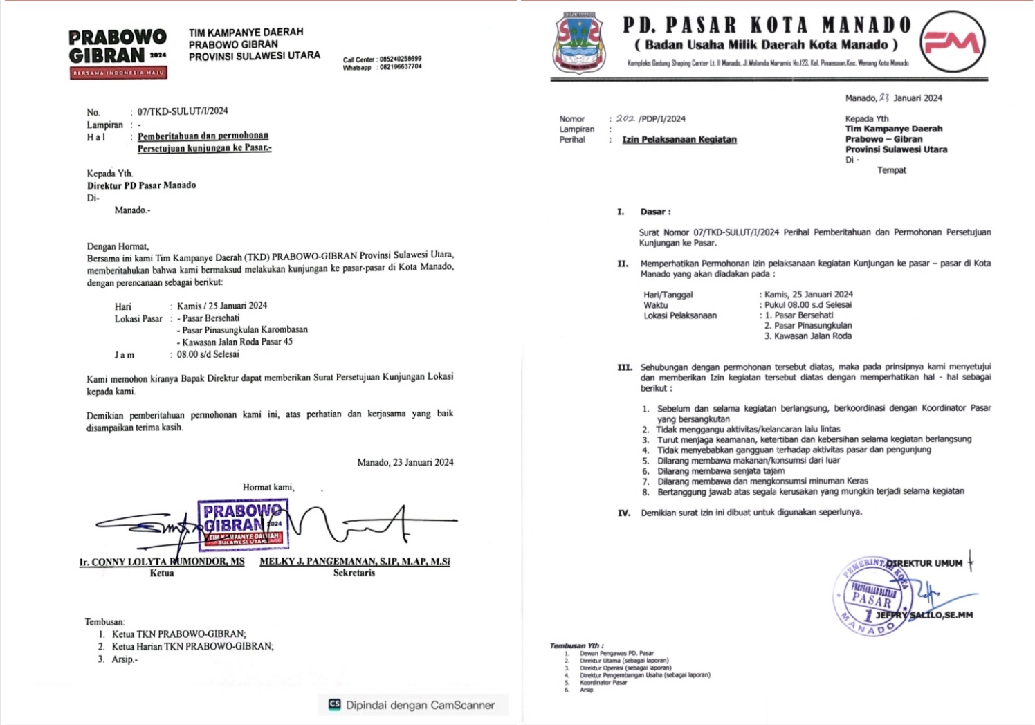 Bahkan Loho menyebutkan “Ini jelas. Jangan seperti yang beredar di media sosial yang sempat viral beberapa hari lalu bahwa kami dari pihak PD Pasar berikan larangan untuk tim relawan dari capres dan cawapres Prabowo Gibran untuk masuk ke pasar. Katanya kami hanya pilih – pilih saja yang akan berkunjung ke pasar, padahal tidak ada surat ijin dan sembarang masuk saja.