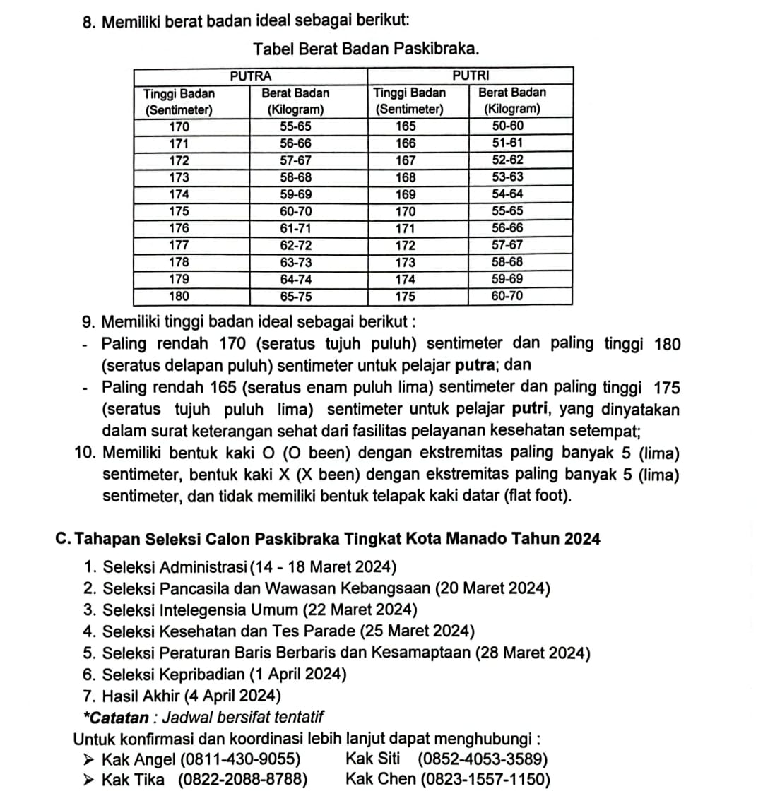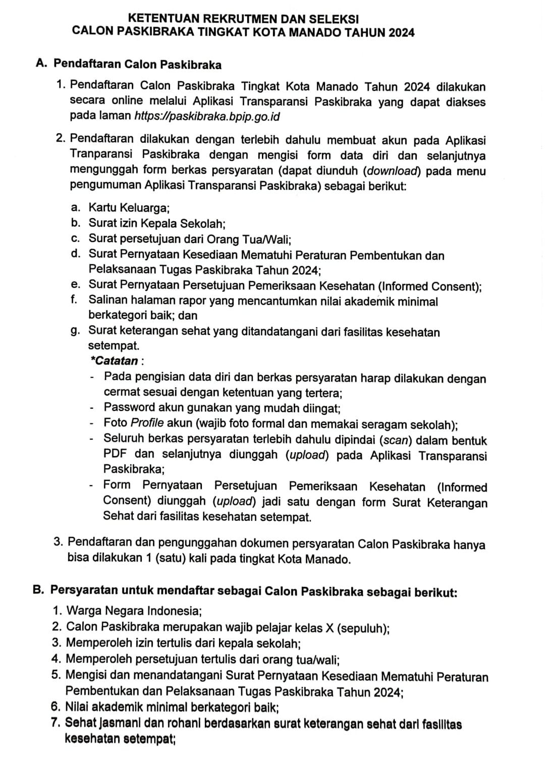 Sesuai surat edaran nomor 200.1/B.05/2024 oleh sekretariat daerah Kota Manado, para calon paskibraka diharuskan mendaftarkan diri sesuai tanggal yang telah ditentukan.