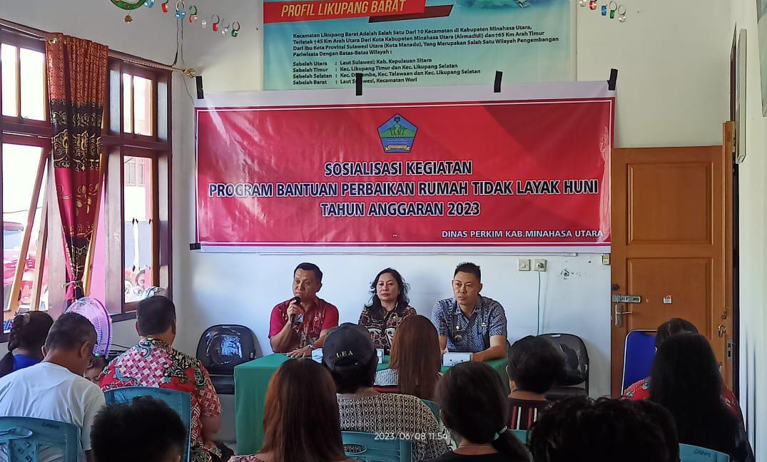 MINUT,UpdateSulut– Pemerintah Kabupaten (Pemkab) Minahasa Utara (Minut) melalui Dinas Perumahan dan Kawasan Permukiman (Perkim) Minahasa Utara menggelar Sosialisasi Kegiatan Program Perbaikan Rumah Tidak Layak Huni Tahun Anggaran 2023, bertempat di Kantor Camat Likupang Barat (Likbar), Kamis (8/06/2023).