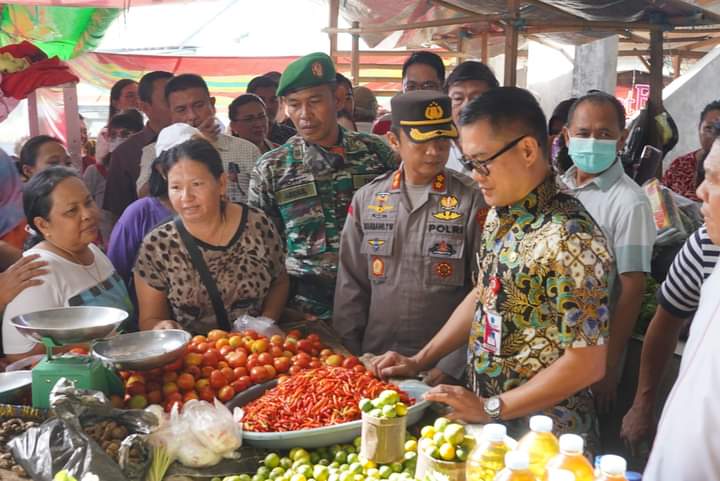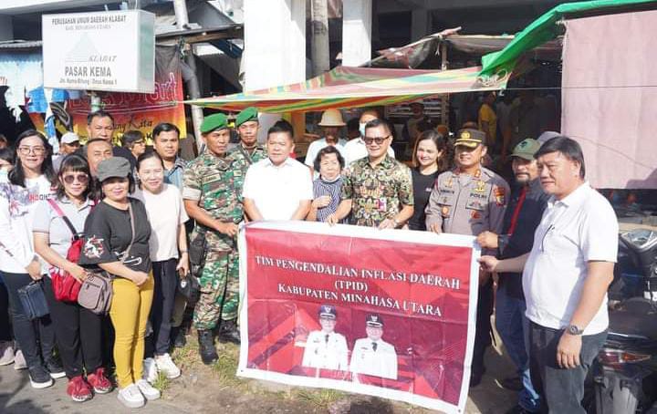 MINUT,UpdateSulut – Untuk memastikan stabilitas harga bahan pokok (bapok) jelang Idul Fitri 1444 H, Pemerintah Kabupaten Minahasa Utara (Minut) Bupati Joune Ganda bersama Tim Pengendalian Inflasi Daerah (TPID) dan Forkopimda bekerjasama dengan Bulog melakukan inspeksi mendadak (sidak) bahan pokok dan operasi pasar, di Pasar Kema, Jumat (14/4/2023).